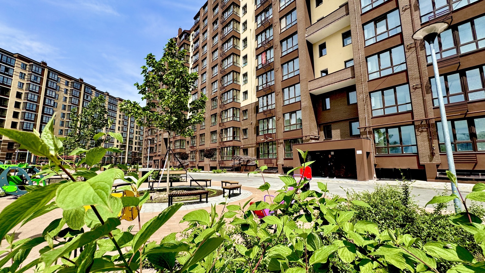 Багатофункціональна прибудинкова територія: дитячий і спортивний майданчики, зона відпочинку для дорослих, паркінг.