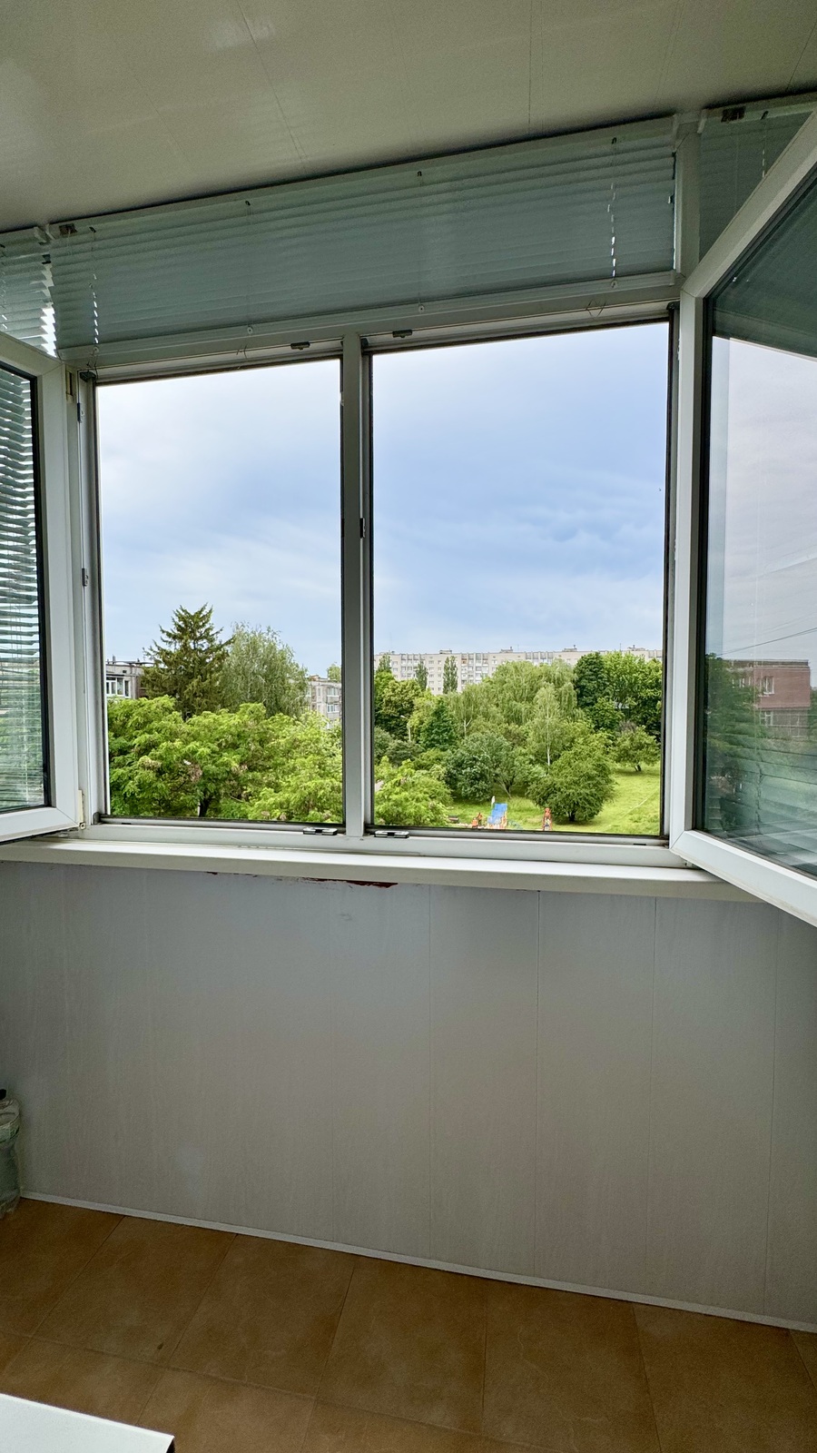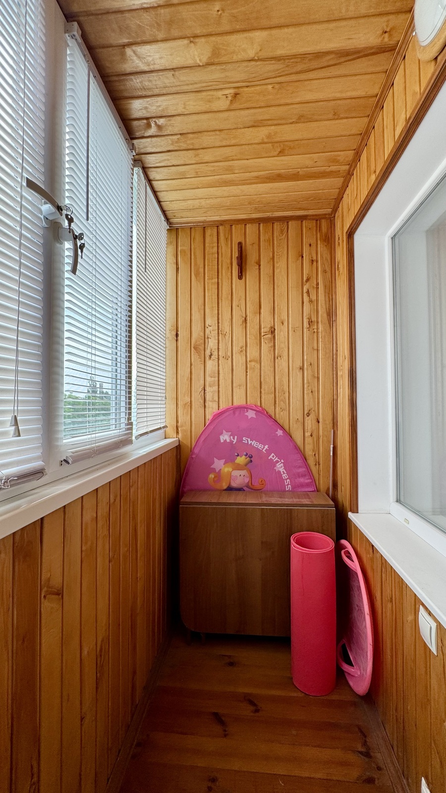 Два балкони: один - дерев’яна обшивка, другий - пластикове оздоблення