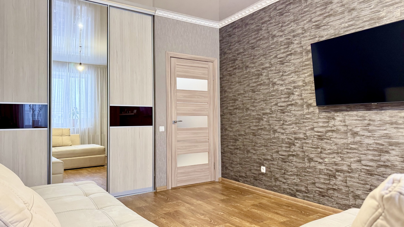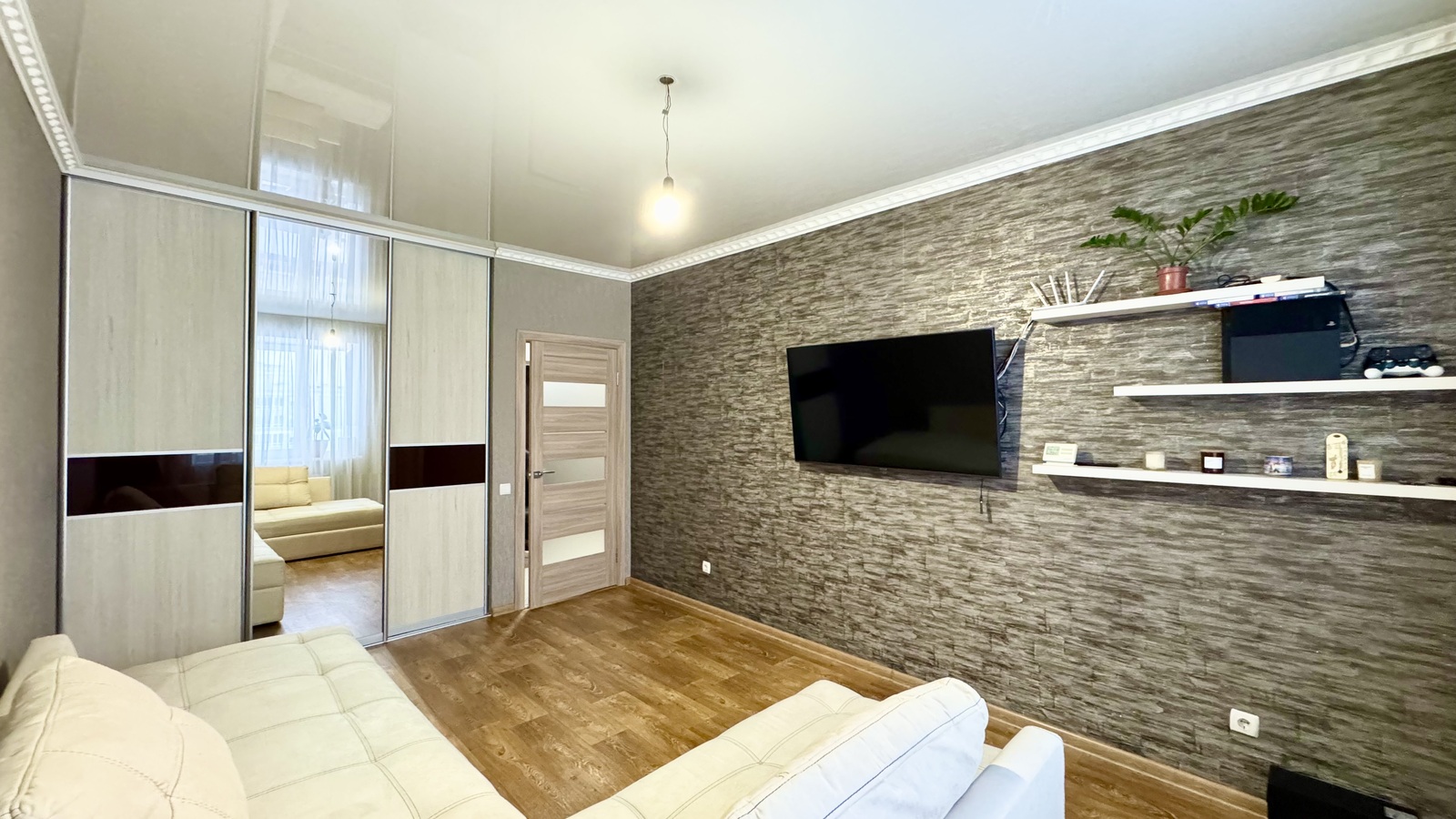 Кімната правильної прямокутної форми,- комфортний розкладний диван, шафа, телевізор, кондиціонер.