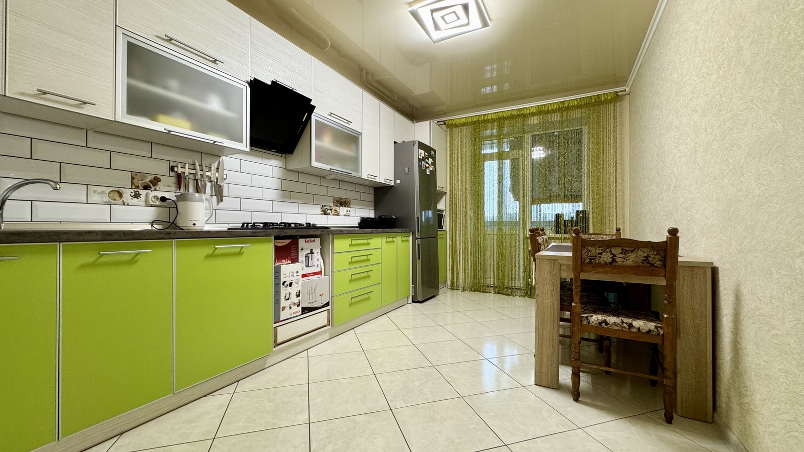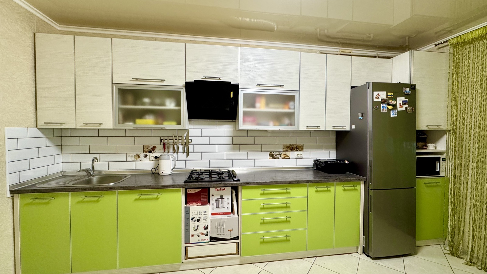 Кухонний гарнітур: варочна панель, холодильник, витяжка, великий сімейний стіл, двоконтурний газовий котел ( схований в шафі ) - самі регулюєте опалення.